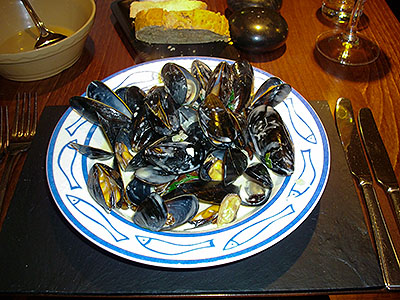 いつもならスターターは本日のスープなんだけど、ここは何か食べたい。悩んだ結果、Local Mussels In a white wine and garlic cream sauceのスターターサイズをオーダー。
