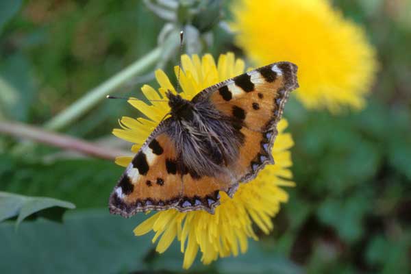 A small butterfly was on the dandelion which was blooming near bus stop. He might be waiting something.