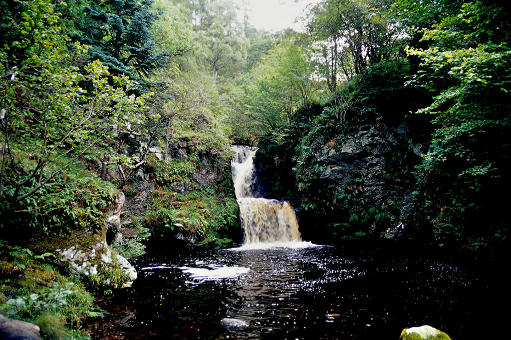 Aberlour南側を散策している時に地図に小さく”Waterfall”の文字を見つけ、Glenallachie蒸留所付近から川沿いの遊歩道に入った。その道は細くてとても歩きにくく、途中牧場の中を横切り、ようやく滝まで着いた。