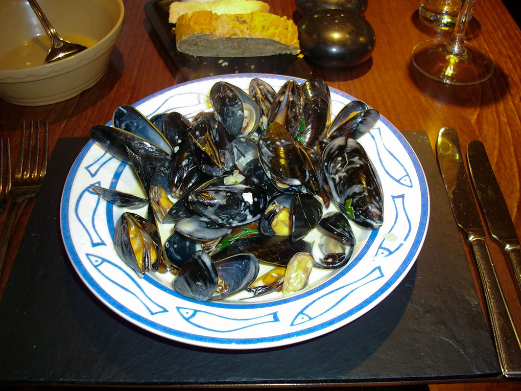 今回は以前から気になっていたメニュー、ムール貝に挑戦。このレストランでは地元のムール貝を白ワインとにんにく、クリームで調理してある。サイズが2種類あって、スターター用に500g、そしてメイン料理としては1kgとなっていた。
