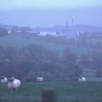 幹線道路から脇道に入ってしばらく歩いても何も見えない。この道を行けば蒸留所への近道のはず。そろそろ何か見えてもいいんだけど・・・よく見ると煙突の先のような物が見えてきた。